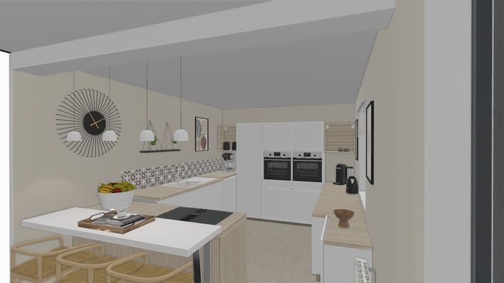 Revoir l'implantation complète de la cuisine, la rendre plus fonctionnelle et apporter une touche de modernité avec de nouveaux meubles et des couleurs claires.