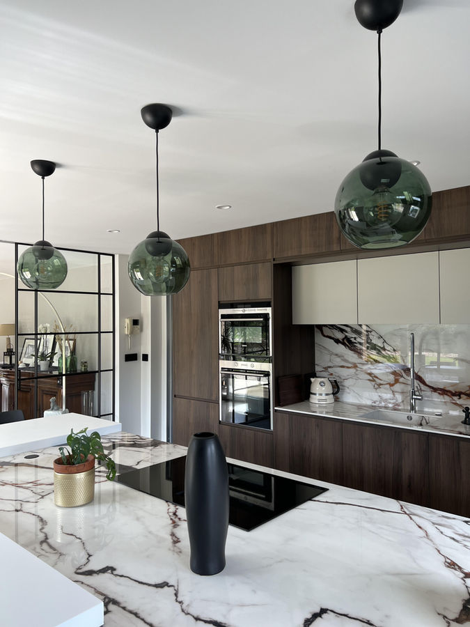 Rénovation totale d’une cuisine avec déplacement d’une cloison afin d’agrandir l’espace et de pouvoir loger un ilôt central.